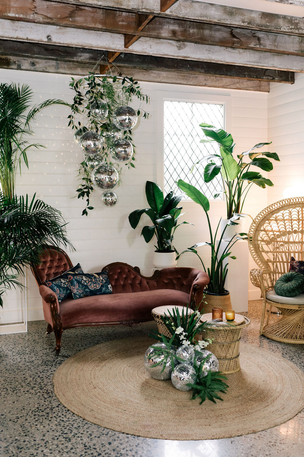 Designed to catch and reflect light in every direction, this installation instantly transforms any space into a retro dream. Pair it with coloured uplighting or fairy lights for maximum sparkle, or go full Studio 54 with florals and fringe.