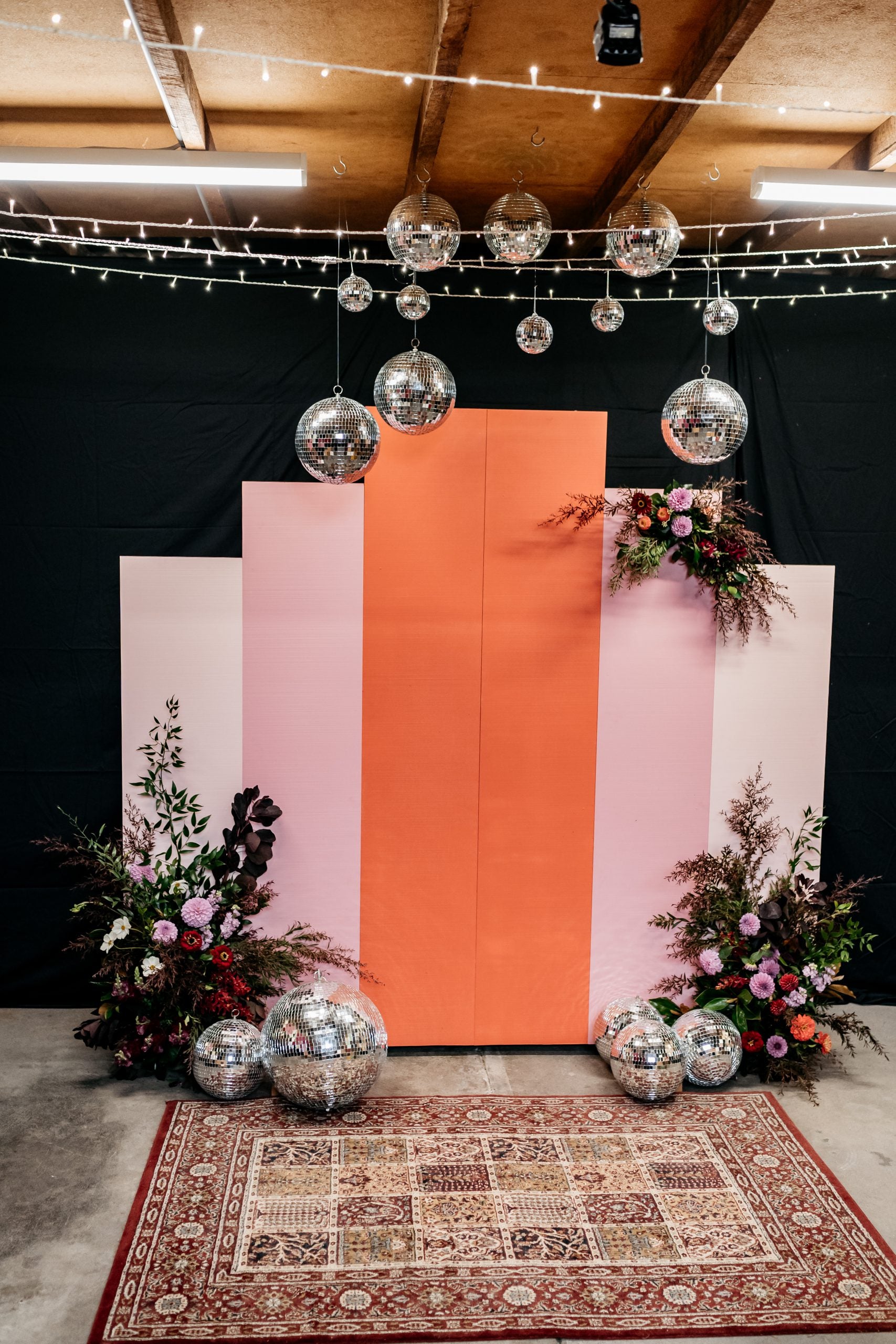 Freestanding geometric panel in funky red/pink/white hues. Two separate pieces for easy transportation.